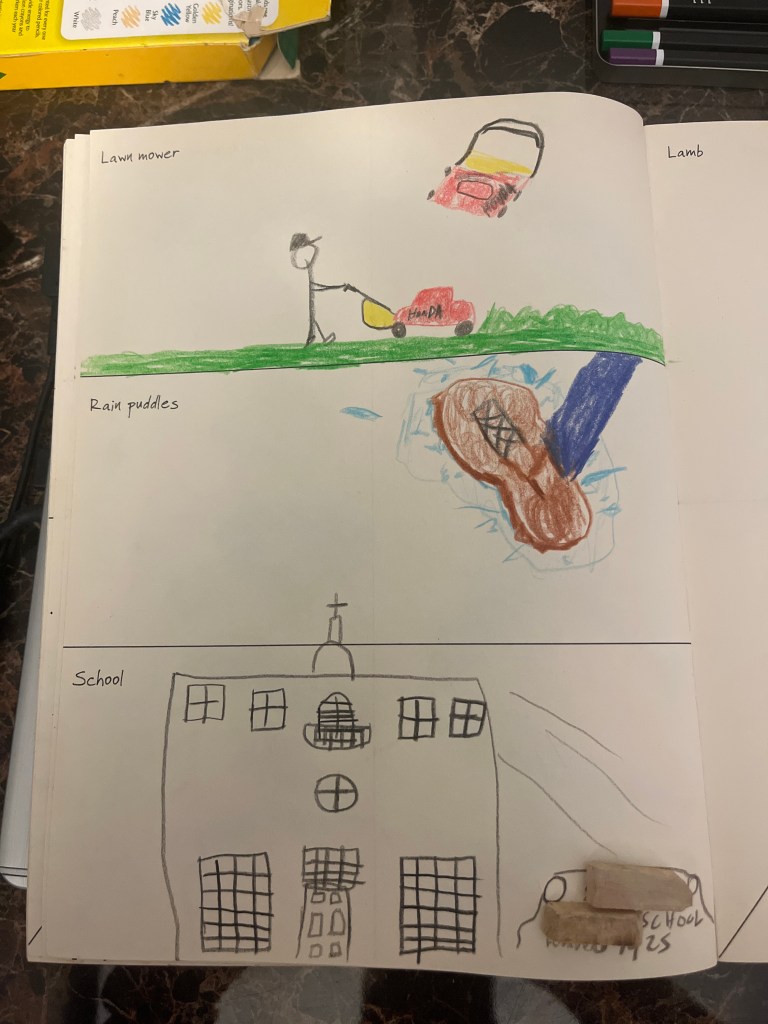I actually think I’ve improved slightly over one day. I really struggled to figure out rain puddles but chose the illustrate stepping on one, did some shoe details, and even used the space to try and work on depth I’ll probably watch some videos on the subject before I go to bed. I have lamb and wolf tomorrow. The wood block are from another project I’m working on, which will probably featured here at some point in 2023 hopefully.