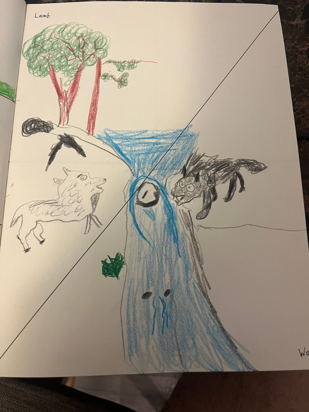 I actually think I’ve improved slightly over one day. I really struggled to figure out rain puddles but chose the illustrate stepping on one, did some shoe details, and even used the space to try and work on depth I’ll probably watch some videos on the subject before I go to bed. I have lamb and wolf tomorrow. The wood block are from another project I’m working on, which will probably featured here at some point in 2023 hopefully.