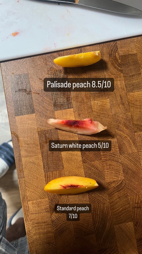 The palisade peach was a small peach with big flavor. Saturn white was a huge disappointment as aesthetically it is the best looking in my opinion but not the best tasting. I will be buying some palisade peaches to enjoy as a snack before the season ends.