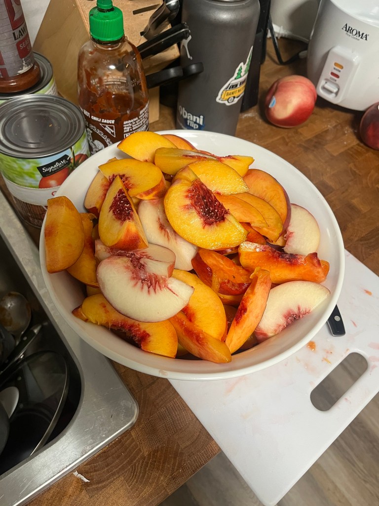 I purchased about 16 peaches but used 12 peaches for the recipe (10 standard, 1 Saturn white, and one palisade) I have not tried the last two peach variety’s so I did a little taste test before making the jam. And truly I was not the biggest fan of peaches but this was an eye opening experience and peaches have definitely climbed on my fruit tier list.