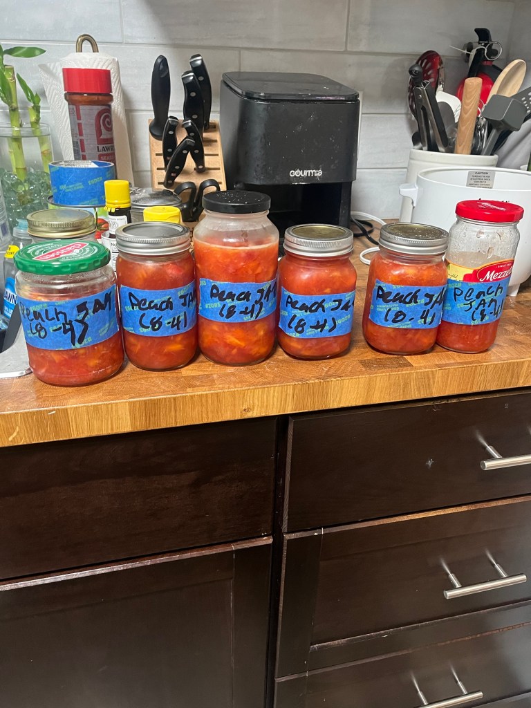 Almost ran out of jars, this is a quick and fun recipe that will certainly elevate my toast and pb&j sandwiches. I do regret not peeling the peaches as the potato masher mashed the fruit but left layers of skin in the jam. This is a minor inconvenience and I actually think it looks nice with the skin in the jam but it did make it a bit harder to eat, so I think next time I’ll take the peels off.