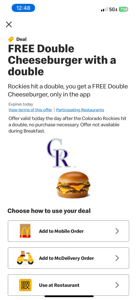At the start of the MLB season McDonalds had partnered with the ColoradoRockies and offered a free double cheeseburger the day after any game where the Rockies hit a double
